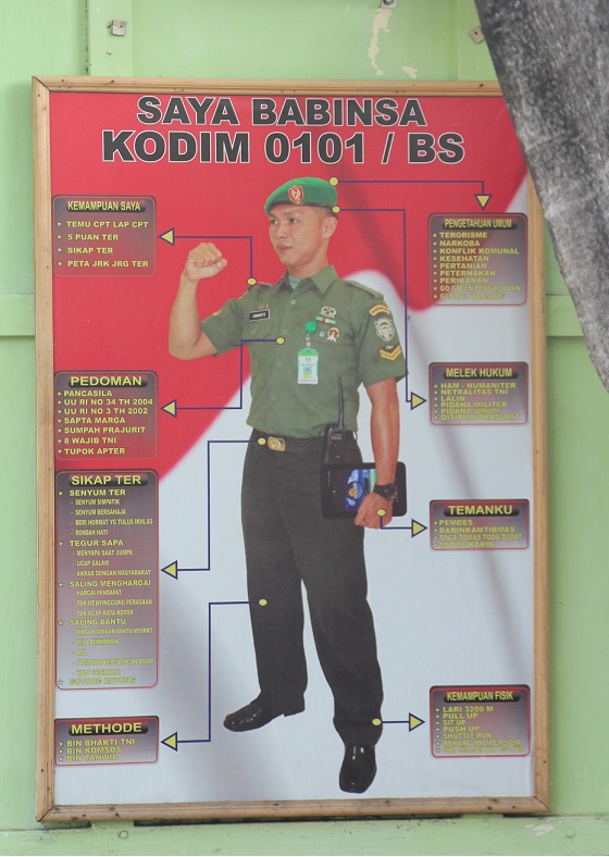 A poster in front of the military regional command (Kodam) office, in Banda Aceh, illustrating the expected personal attributes of a Babinsa / Emirza Adi Syailendra.